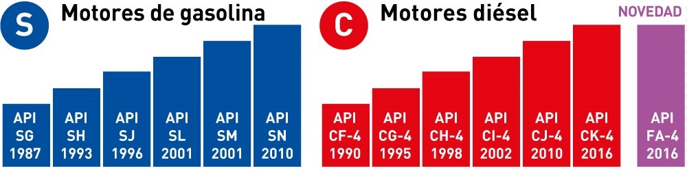 La segunda clasificación, según normativa API, se refiere a la calidad del propio aceite. Se enumera a través de dos letras, CK-4, por ejemplo. La primera letra hace referencia al tipo de combustible –S para gasolina y C para Diesel– mientras que la segunda estipula la calidad y modernidad del aceite. La letra K caracteriza a los aceites para su uso en motores diésel de alta velocidad y de ciclo de cuatro tiempos diseñados para cumplir con los estándares de emisiones de escape en carretera del modelo 2017, mientras que -4 significa el nivel de motores fuera de carretera. Para más informacion puedes consultar api.org.